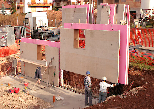 La struttura è composta di elementi prefabbricati. Pareti, soffitto e scale sono consegnati giá pronti facendo risparmiare un sacco di tempo. Anche in questo caso devono essere gettate le fondamenta come primo step. Le pareti vengono fornite e montate come doppio elemento integrato. Tutte le aperture necessarie per porte, finestre e ventilazione sono giá incluse nell`elemento-muro. I serramenti possono essere eventualmente ordinati insieme al componente prefabbricato stesso. Successivamente viene costruito il supporto per le solette, finendo con il soffitto.